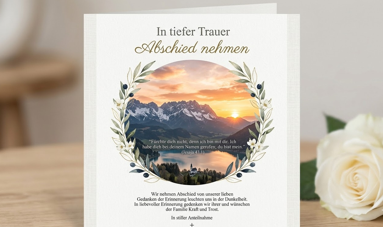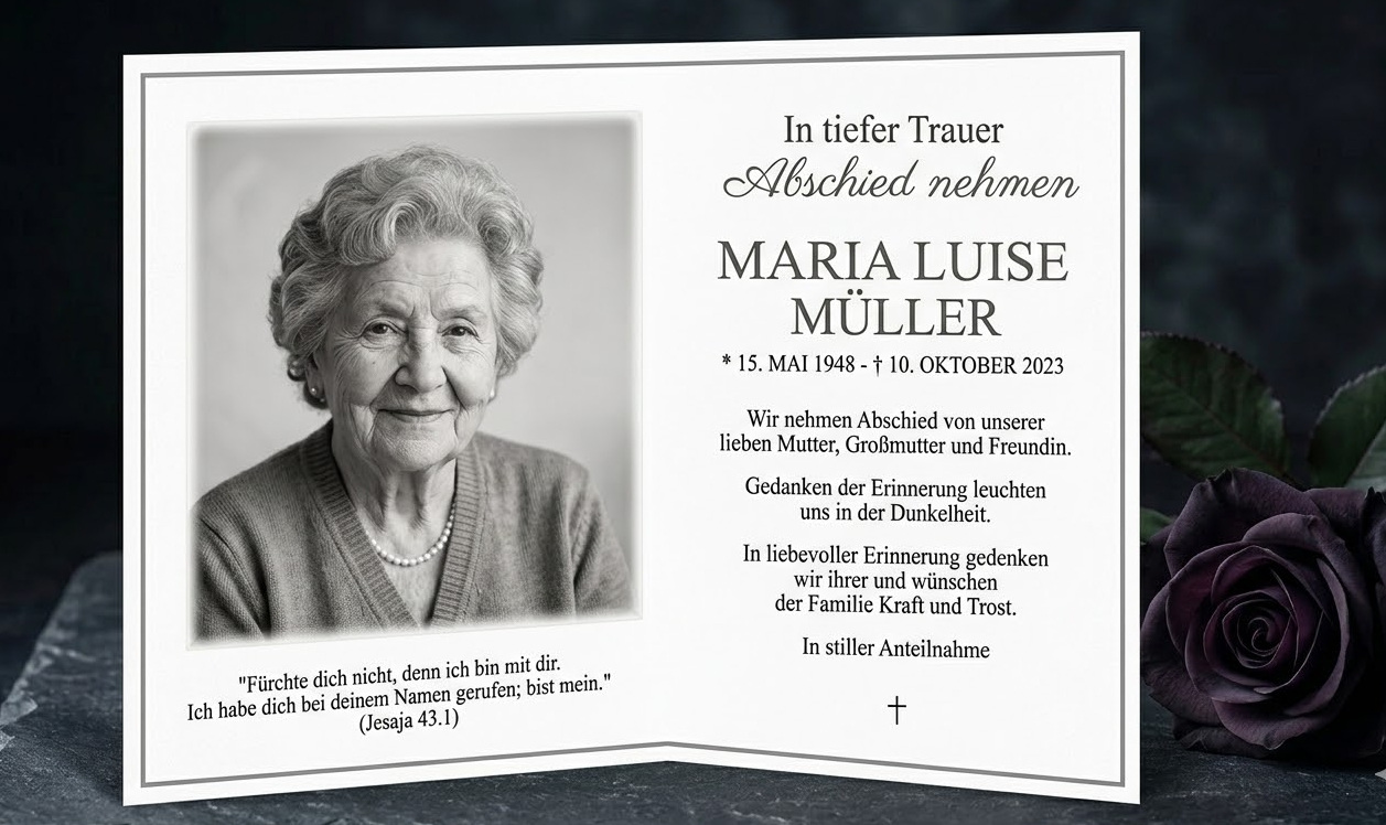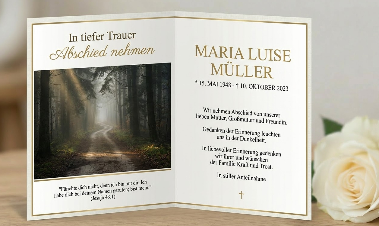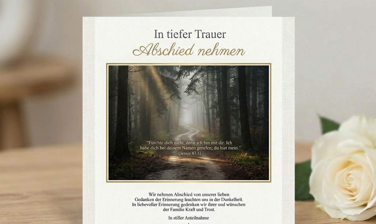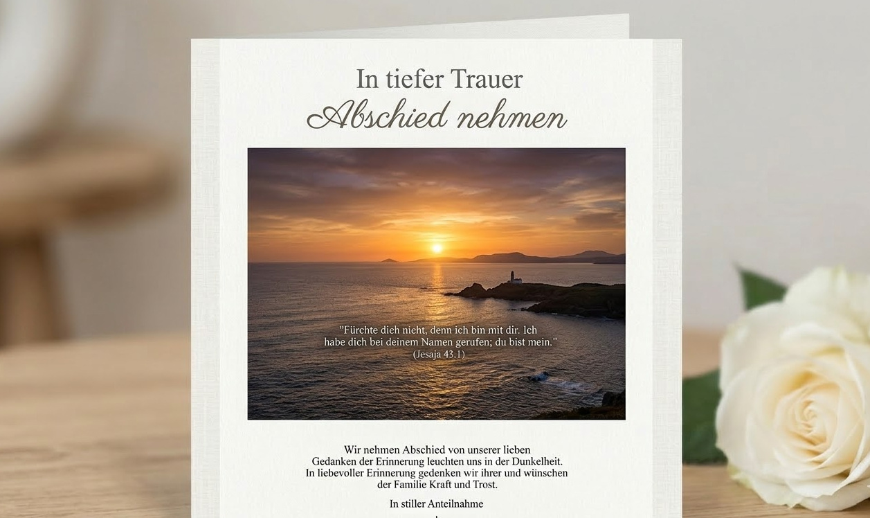 Wir wissen, dass die Gestaltung einer Trauerkarte eine große emotionale Herausforderung darstellt. Deshalb haben wir für Sie eine Auswahl an Referenzen zusammengestellt, die Ihnen als Wegweiser dienen sollen. Unsere Vorlagen reichen von klassischen, schlichten Designs bis hin zu modernen, Natur-verbundenen Motiven.